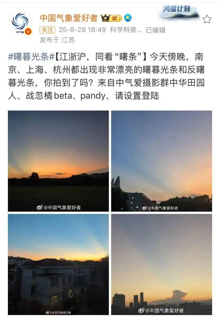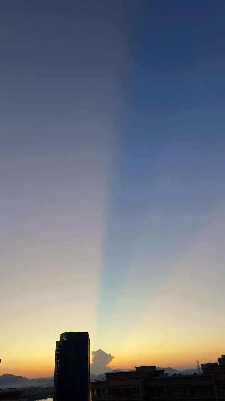 除了杭州,昨天江浙沪都在同看“曙条”,中国气象爱好者说,昨天傍晚,南京、上海、杭州都出现非常漂亮的曙暮光条和反曙暮光条。(两者是同一种现象,只是观测角度不同)