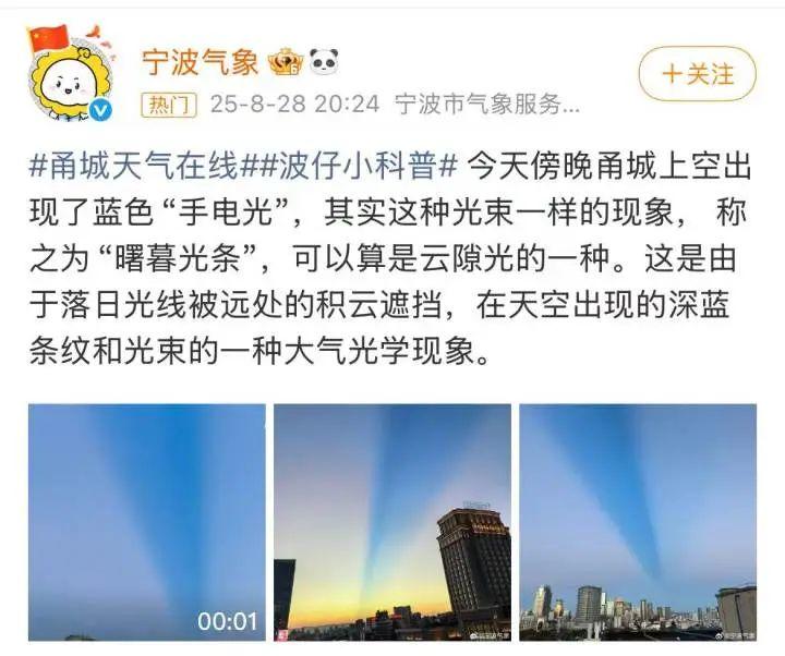 宁波市气象服务中心也科普说,其实这种像蓝色“手电光”光束一样的现象, 称之为“曙暮光条”,可以算是云隙光的一种。这是由于落日光线被远处的积云遮挡,在天空出现的深蓝条纹和光束的一种大气光学现象。